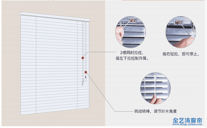 2、拉動(dòng)百葉窗簾時(shí),握住手柄豎百葉拉動(dòng)一根拉繩(橫百葉拉動(dòng)全部拉繩)可將葉片拉開(kāi)。