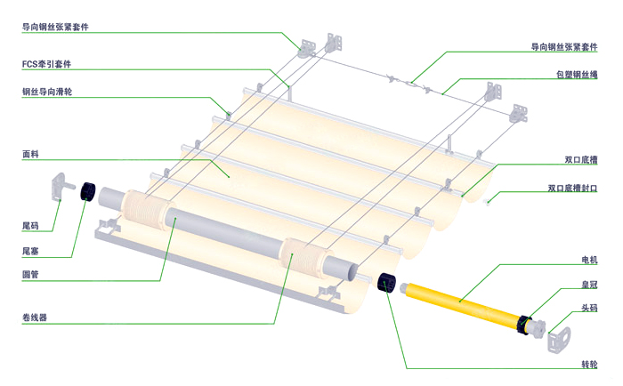 FCS天棚簾系統每個獨立單元由一臺管狀電機驅動,通過循環鋼絲牽引拖布桿運動,從而帶動面料運動,使系統打開或關閉,以達到對光線強弱控制的目的。