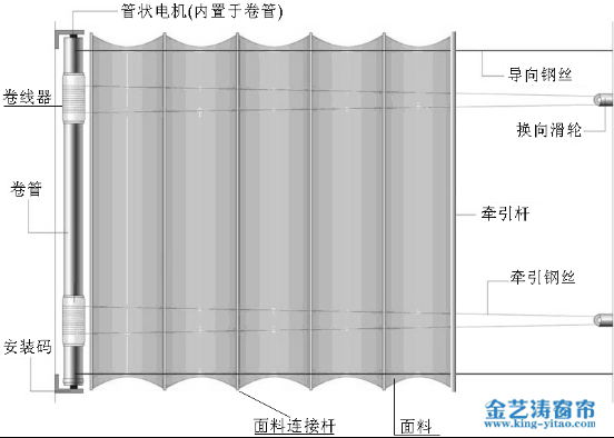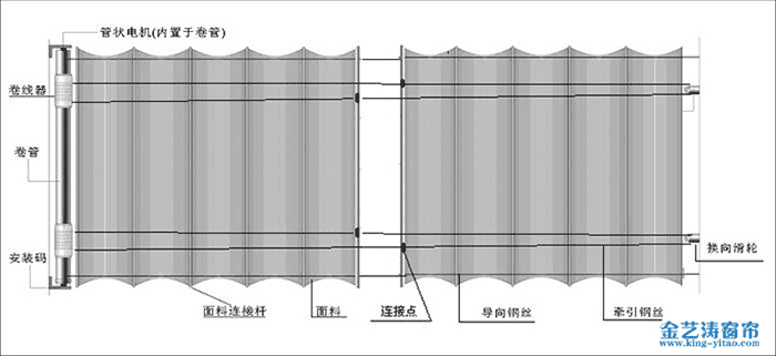 4.面料牽引桿與牽引鋼絲繩連接,在卷管(電機)帶動下面料沿著導向鋼絲繩往復運行,實現窗簾的開合。